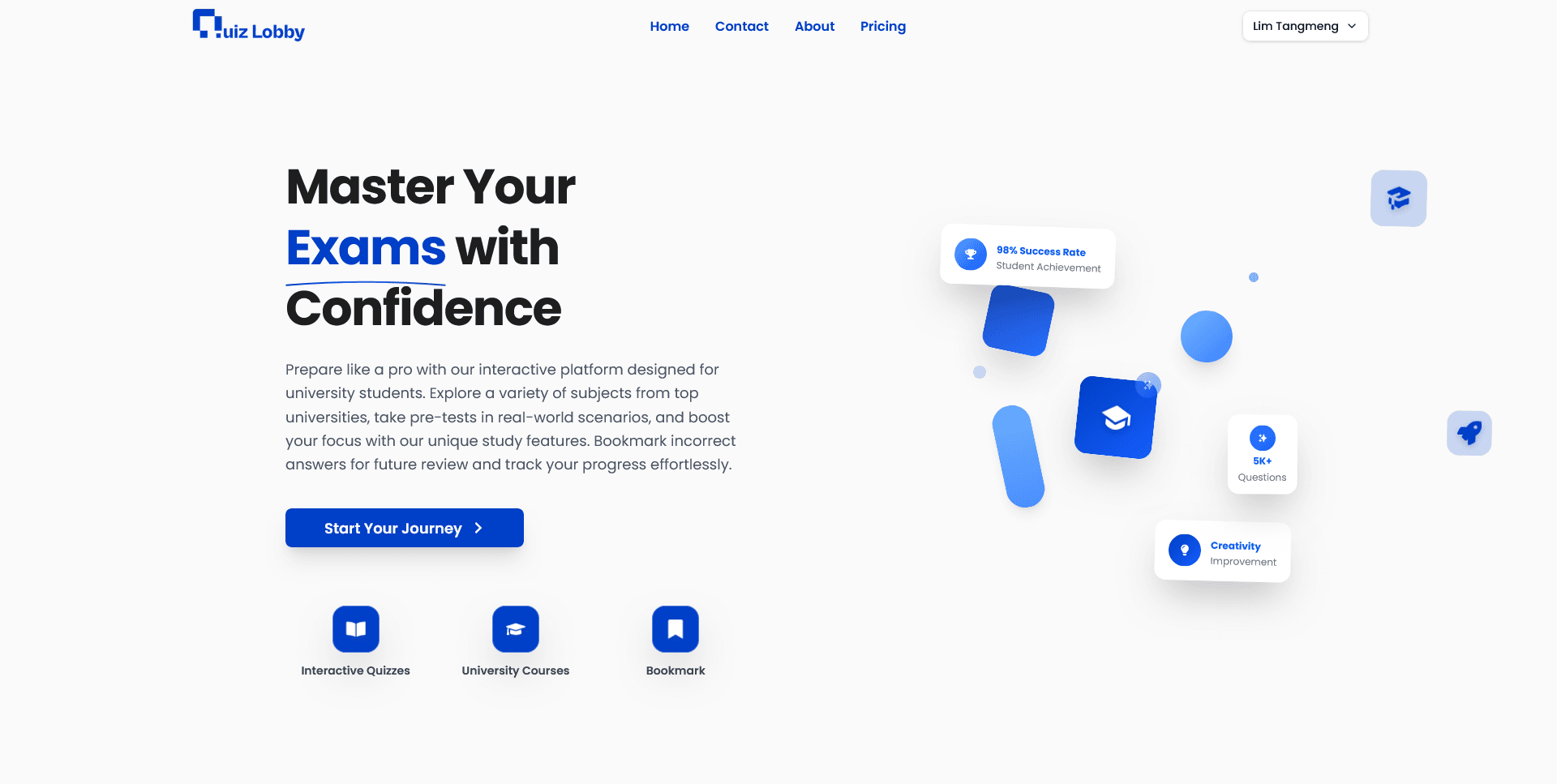 Quiz Lobby គឺជាវេទិកាអប់រំអន្តរកម្មដ៏ទំនើបដែលរចនាឡើងជាពិសេសសម្រាប់ MCQ និស្សិតសាកលវិទ្យាល័យនៅកម្ពុជា។ វាផ្តល់ឱ្យនិស្សិតនូវឱកាសក្នុងការរៀបចំខ្លួនសម្រាប់ការប្រលងតាមរបៀបវិជ្ជាជីវៈ តាមរយៈការធ្វើតេស្តមុនប្រលងអន្តរកម្ម ការរៀនដោយផ្តោតអារម្មណ៍ និងការតាមដានវឌ្ឍនភាពការសិក្សា។