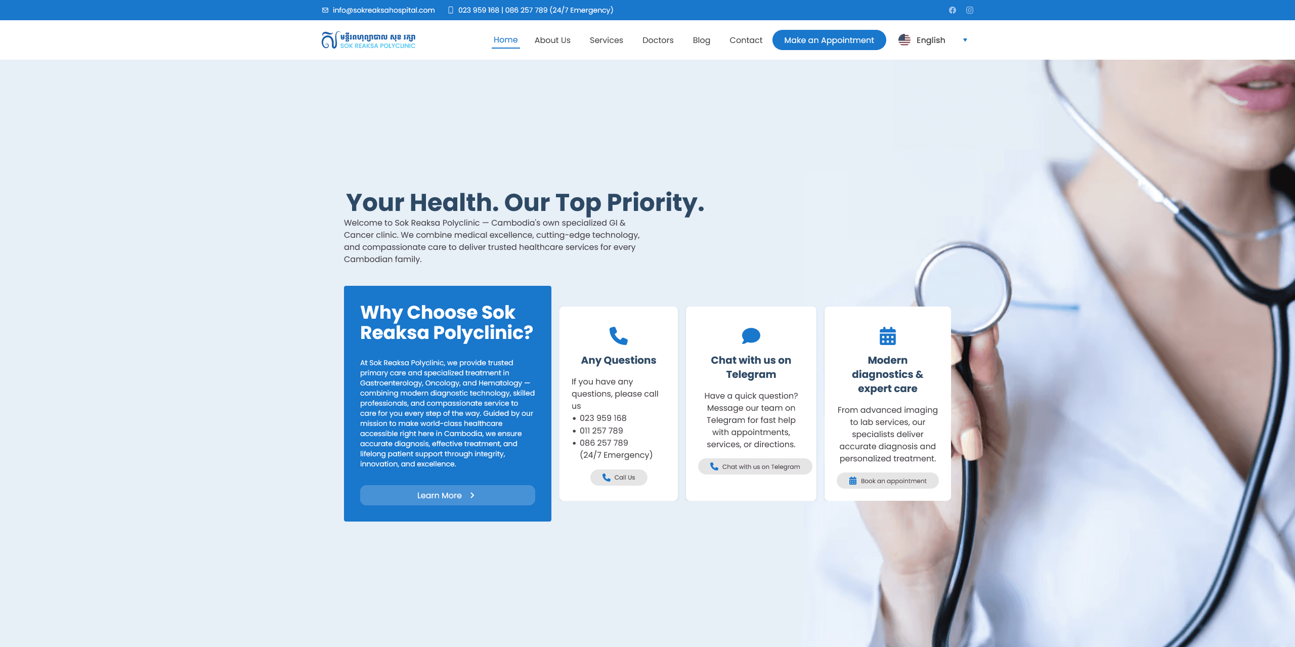 យើងបានរចនា និងអភិវឌ្ឍគេហទំព័រពហុភាសា (ខ្មែរ អង់គ្លេស ជប៉ុន និង ចិន) ដែលមិនត្រឹមតែបង្ហាញពីសេវាកម្មរបស់ពួកគេប៉ុណ្ណោះទេ ប៉ុន្តែថែមទាំងបង្កើតទំនុកចិត្ត និងភាពងាយស្រួលក្នុងការប្រើប្រាស់សម្រាប់អ្នកជំងឺ។